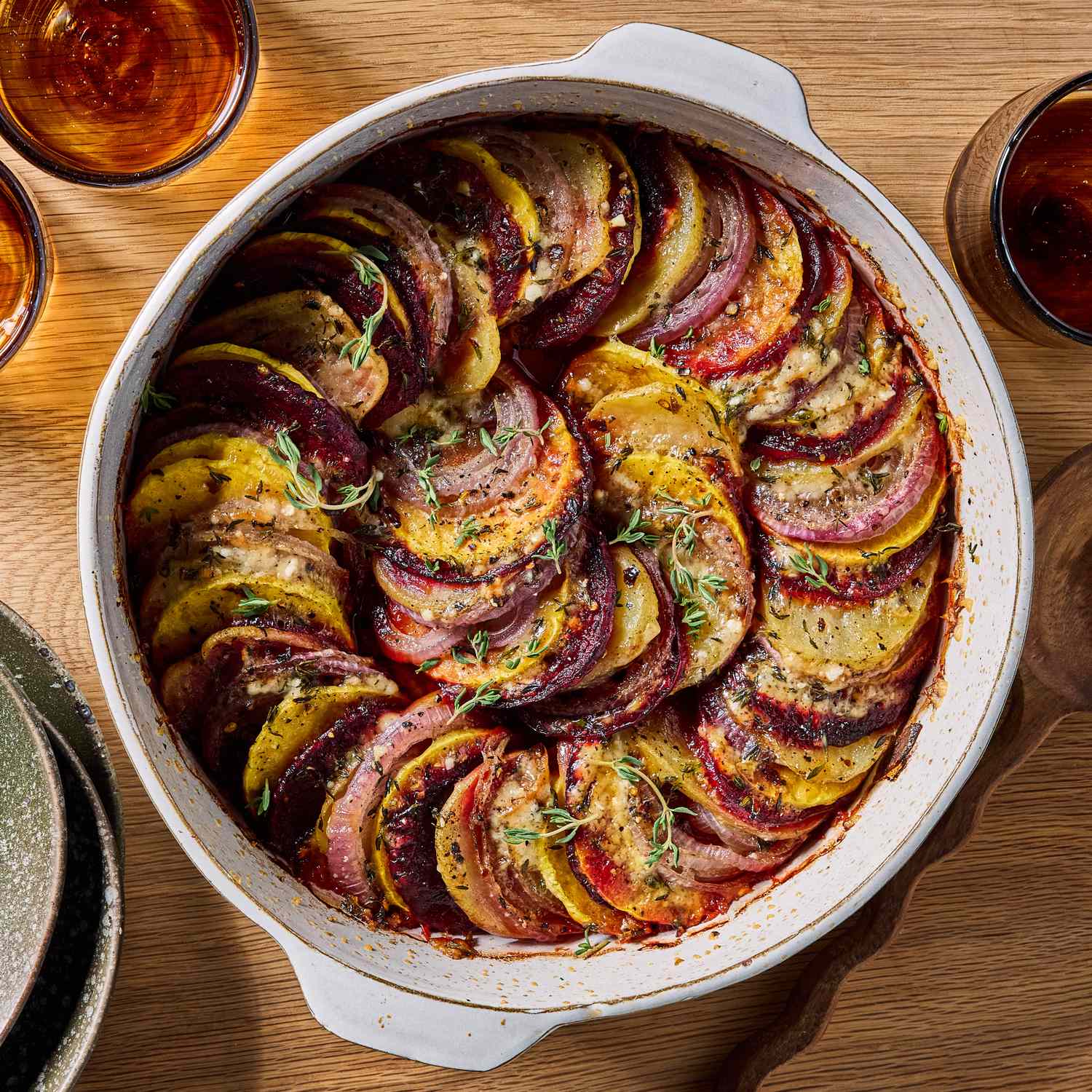 Layers of butternut squash, red onion, potato and beets combine to create this stunning casserole. A quick garlic-infused oil is brushed onto the vegetables to get savory flavor in every bite.