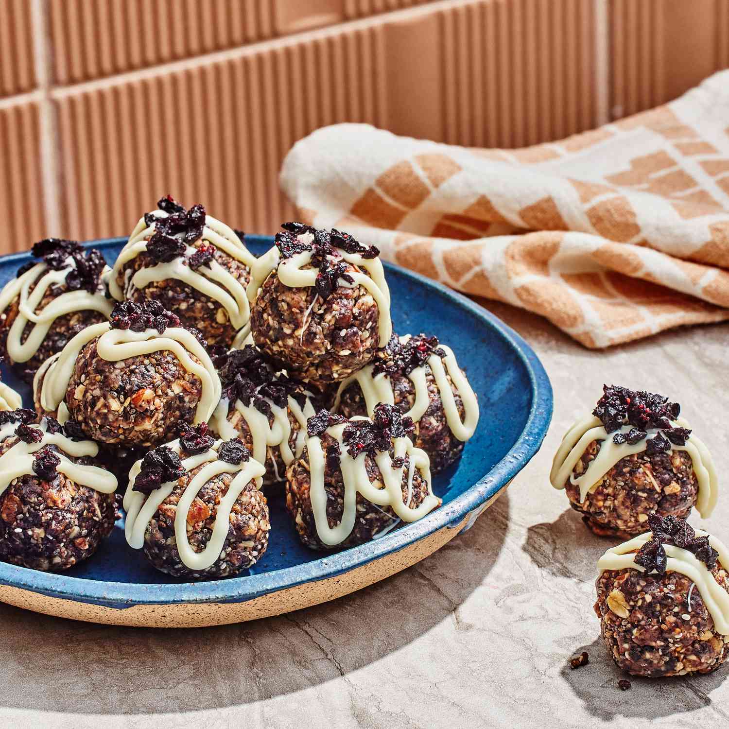 Dried blueberries and pecans team up with cacao nibs for a chocolaty treat any time of day. The cacao is a bit more bitter than chocolate, but the maple syrup helps tame it. Almond butter and chia seeds provide protein to make these bites substantial snacks to fuel your body.