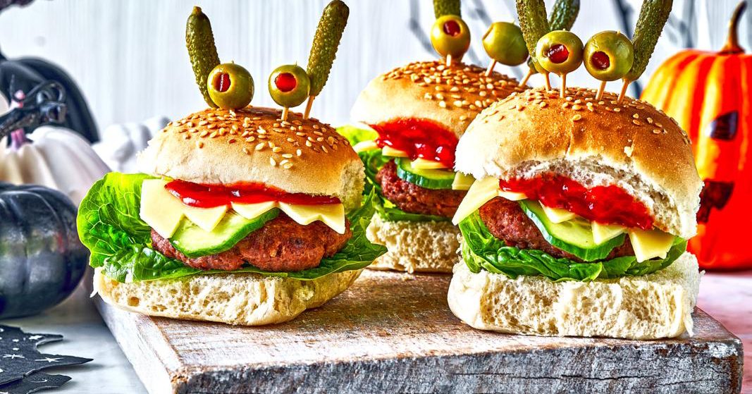 Bring burgers to life with these mini monsters at a Halloween or kids’ party. They’re easy to make and lots of fun. Not only do they take less than 15 minutes to cook, but the recipe is easily sized up to feed a crowd.