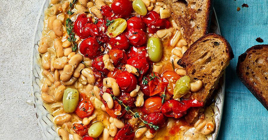 Spoon some of the tomato oil into a frying pan (keep the leftover oil for salad dressings or use to marinate antipasti, or finish dishes), and fry the sourdough for 2 mins on each side until golden and crisp. Serve the tomatoes over the beans, drizzle over a little more of the tomato oil. Add some of the thyme and serve with the fried bread.