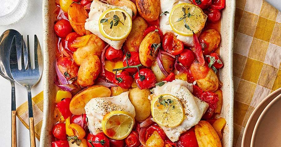 Healthy RecipesFish traybake with red pepper and tomatoes by Editorial team August 13, 2025 written by Editorial team August 13, 2025 29Cook this easy fish traybake for a healthy family meal midweek, with nutritious peppers, onions and cherry tomatoes. It’s low in fat too FishPepperredTomatoestraybake 0 comments 0 FacebookTwitterPinterestThreadsBlueskyEmail Editorial team previous post 7 Restaurant Chains With the Best Ribeye Steaks next post This Diet May Lower Cancer Risk by 24% You may also like The Daily Brain-Boosting Food Neurologists Swear By October 5, 2025 10+ Easy Friendsgiving Recipes October 4, 2025 10 Easy Chicken Dinners Ready In 30 Minutes... October 4, 2025 Five-Bean Salad October 4, 2025 Cozy Casseroles to Improve Your Gut Health (&... October 3, 2025 Best slow cooker cookbooks to buy in 2025 October 3, 2025 Zooey Deschanel’s Go-To Overnight Oats Are “So Easy” October 3, 2025 Best biotin supplements for healthy hair, skin and... October 3, 2025 Sophie Wyburd recipes October 3, 2025 10+ Magnesium-Rich Snack Recipes October 2, 2025Leave a Comment Cancel ReplySave my name, email, and website in this browser for the next time I comment.