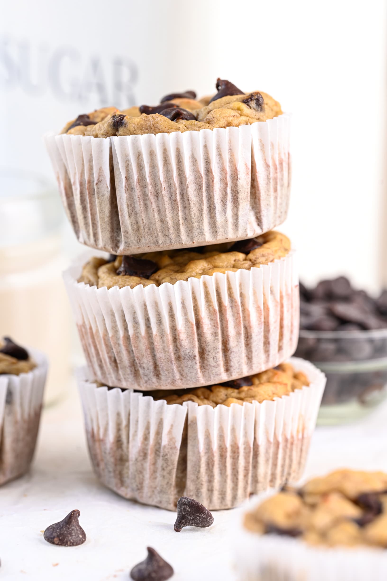 Divide the batter evenly between the muffin cups and top with more chocolate chips, if you desire.
