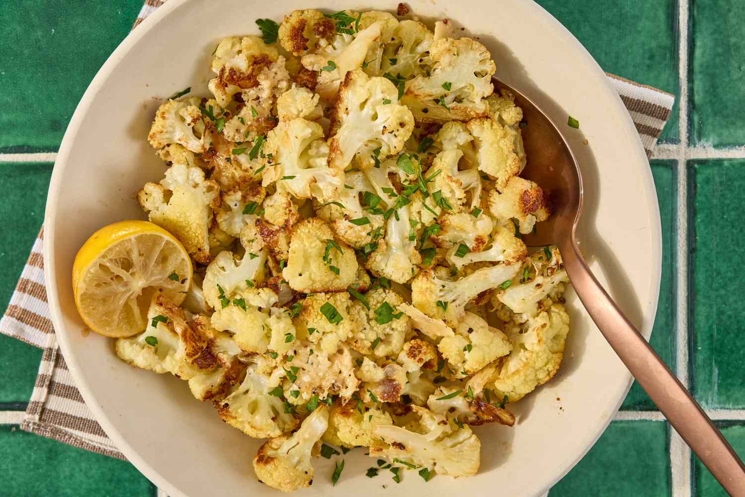 Our Roasted Cauliflower recipe is a classic for a reason. The simplicity, prep time and flavor are all reasons why you should be making this tonight. Fiber-rich cauliflower is roasted to perfection at high heat with heart-healthy extra-virgin olive oil, aromatic garlic powder, salt and pepper. We also place the lemon wedges in the roasting pan to add more depth to the lemon flavor and to soften them, which yields more juice. Freshly grated Parmesan cheese at the end gives the most delicious salty umami flavors, which perfectly complement the cauliflower. Top with the bright, fresh parsley, and you’ve got a winning side. Keep reading for our expert tips on choosing your cauliflower, using this recipe for other veggies and more.