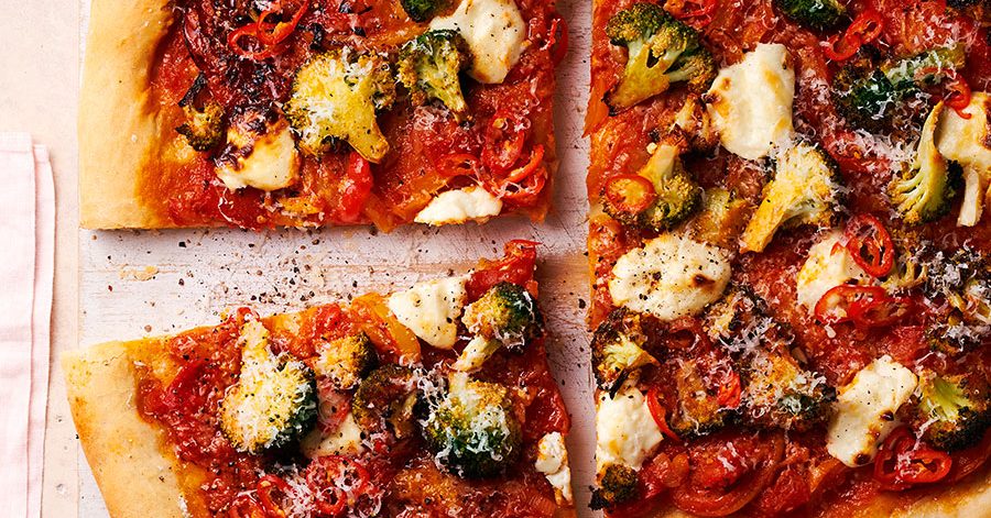 Stretch the dough out using your hands and tip onto a large sheet of baking parchment. Continue stretching it out until it’s roughly the same size as the baking tray. Spread the peperonata over the base, then stir together the broccoli and vinaigrette. Dot the broccoli evenly over the top along with the mascarpone, then scatter over the red chilli and parmesan. Drizzle the oil evenly over the top.