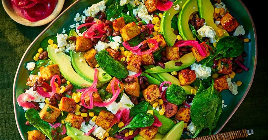 Tip all the dressing ingredients into a blender and blitz until smooth. Season to taste. To build the salad, put the spinach in a bowl and toss well with some of the dressing. Add the black beans, sweetcorn, feta, avocado and red onions. Scatter over the cooked tofu and drizzle over any of the remaining dressing.