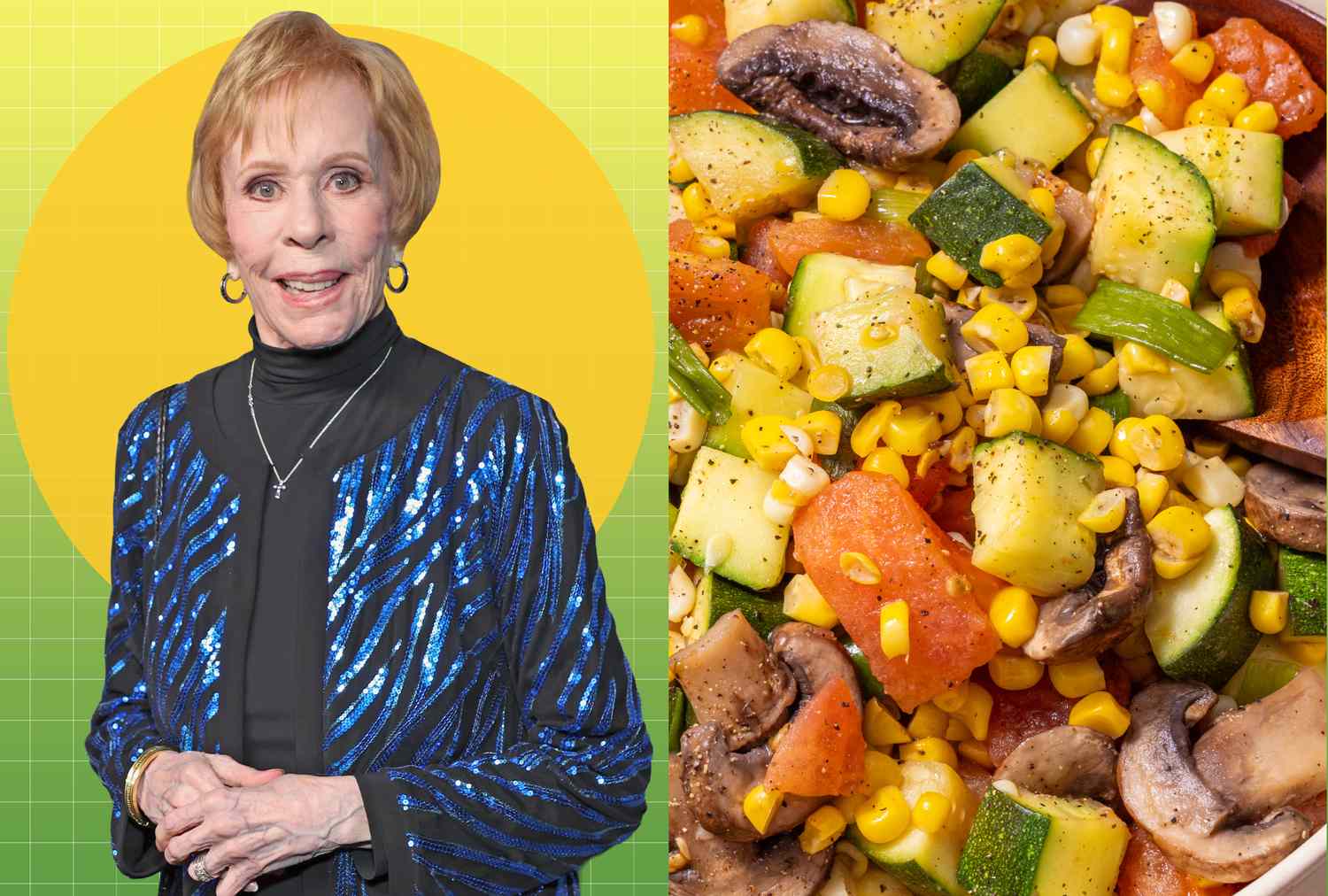 Comedy legend Burnett’s vegetable medley, a veggie sauté with zucchini, corn, tomatoes, green onions, mushrooms and a touch of butter, plus salt and pepper to taste, is simple. But it might just be the perfect side of warm veggies for your supper tonight. Here’s how to recreate it at home.