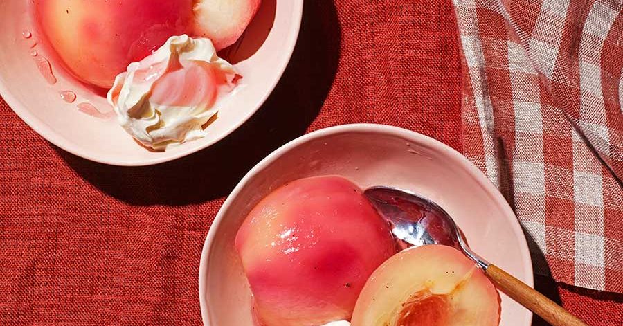 In a wide saucepan (large enough to accommodate the halved nectarines in a single layer), combine 625ml water, the sugar, half of the ginger, half of the cardamom pods and crushed seeds, and a pinch of salt. Bring to the boil over a medium-high heat, stirring occasionally, until the sugar dissolves, around 8-10 mins.