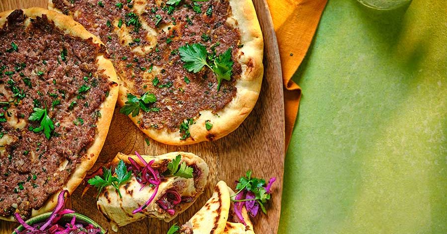 Heat the oven to 200C/180C fan/gas 6. Lay the flatbreads out on a large baking tray after sprinkling the underside with a little water, then flip. Divide the meatball mixture between them evenly. Spread out to the edges then drizzle with the oil. Bake for 10-12 mins until brown and cooked through.