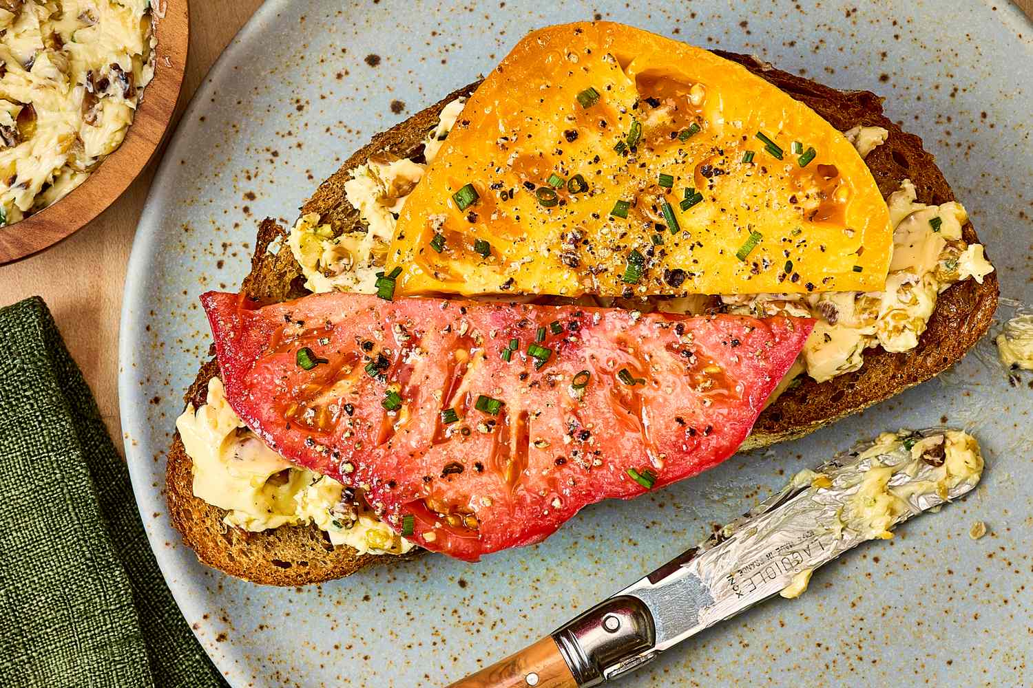 This tomato toast is a fresh, summery take on a simple classic. Sweet corn kernels are charred until golden and smoky, then blended into butter. Slathered on toasted bread and topped with ripe, juicy tomatoes, this dish is a vibrant combo of sweet, savory and tangy flavors. The corn butter is easy to make ahead and can be kept on hand to add to everything from grilled vegetables to seafood or pasta.
