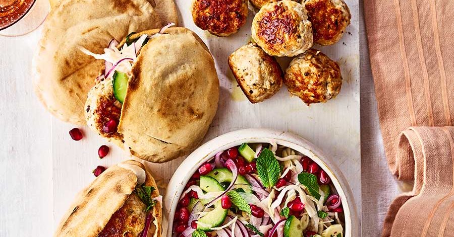 Pair subtly spiced sumac turkey meatballs with sweet-and-sour slaw to make these thrifty pittas – on the table in just 25 minutes. This budget-friendly dinner showcases cheap veg, with everyday spices and herbs providing a boost of flavour. Plus, any leftover raw meatballs can be frozen.