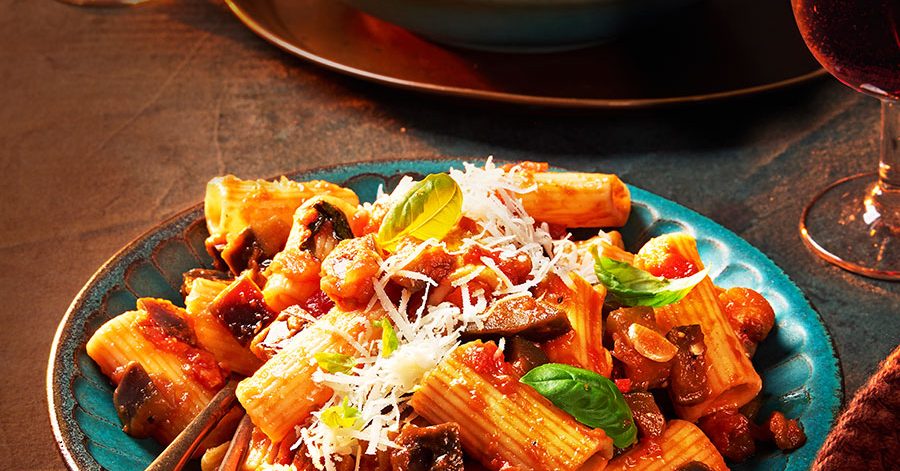 Heat most of the oil in a large frying pan over a medium heat. Fry the aubergine for 10-12 mins, stirring occasionally until golden brown and soft. Stir in the garlic and chilli, and cook for 2 mins more until fragrant. Tip in the tomatoes, then swill out the can with a splash of water and pour that in too. Stir in the vinegar, sugar and tied basil stalks, then season well. Simmer for 15 mins, stirring occasionally until thick and saucy.