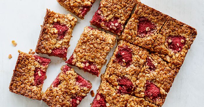 Using just five ingredients, these raspberry honey flapjacks are super easy to whip up for a mid-morning snack. Frozen raspberries work better than fresh here as they maintain their shape when baking.