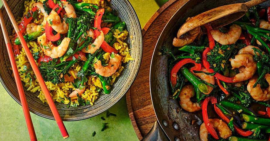 Meanwhile, combine the lime juice, sugar, soy sauce and oyster sauce together in a small bowl. Heat the oil in a large frying pan over a medium heat. Stir in the garlic and ginger and cook for 2-3 mins until fragrant. Tip in the broccoli, pepper and prawns. Cook for 4-5 mins until the prawns are cooked through and the veg is tender. Drizzle in the sauce and stir well to combine. Serve with the coconut curry rice and the coriander scattered over the top.