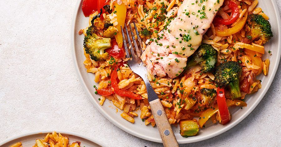 Meanwhile, heat the oil in a large frying pan over a medium-high heat. Stir in the onion with a pinch of salt and cook for 8-10 mins until beginning to soften. Mix in the garlic and cook for 1-2 mins until fragrant. Stir in the peperonata and orzo with a splash of boiling water from the kettle. Cook for 4-5 mins until warmed through.