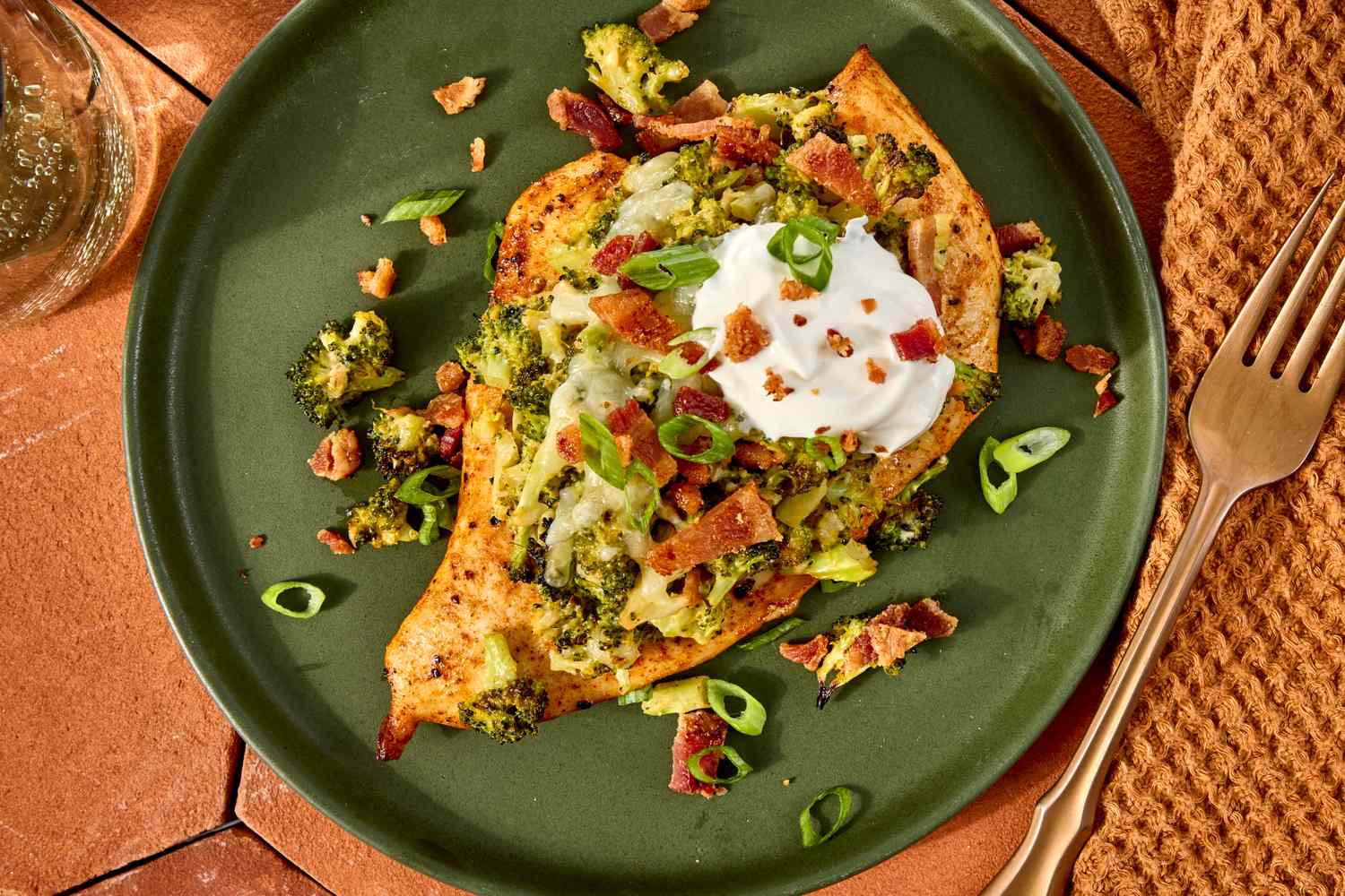 These Loaded Chicken Cutlets have the advantage of lean protein compared to the OG potato recipe. Well-seasoned chicken cutlets and broccoli roast quickly in the oven. The antioxidant-rich broccoli then gets a further flavor upgrade when it is mixed into a creamy cheese-and-bacon mixture, while scallions and lemon zest help cut through some of the richness. This is a classic flavor bomb that’s a meal in and of itself. Keep reading for our expert tips, including what ingredients can be swapped for something else.