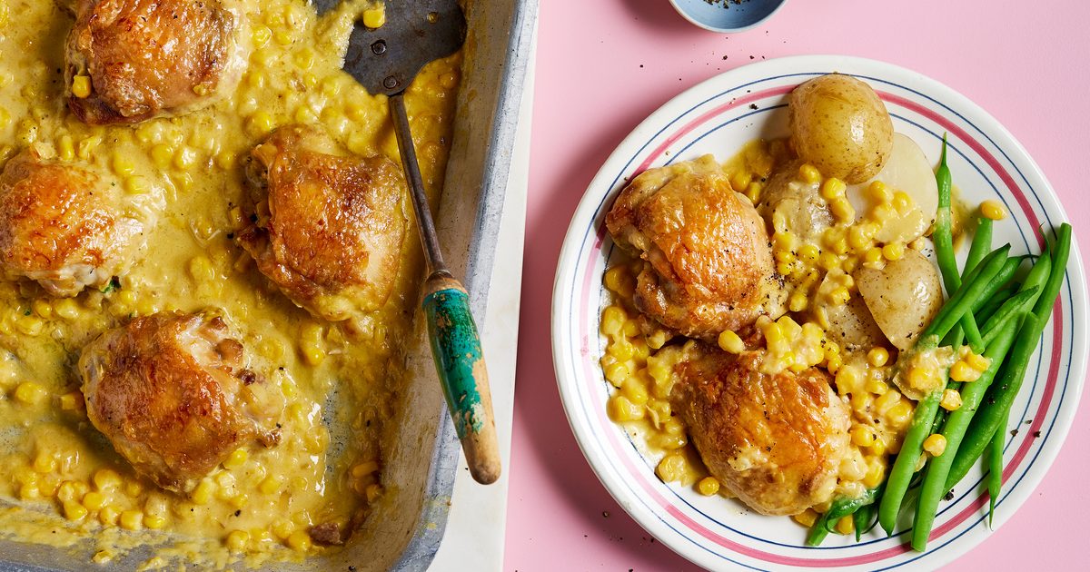 Heat the oven to 220C/200C/gas 7 or air fryer to 180C. Heat a deep-sided frying pan or shallow casserole dish on a medium heat. Add the butter then once melted, stir in the onion and cook for 5 mins until soft. Stir through the garlic and corn and cook for 2-3 mins. Dissolve the miso in the stock then pour into the corn, cook for 5 mins. Stir through the crème fraîche and season to taste. Pour into a baking dish or if air frying, pour the corn mix into an air fryer safe dish.