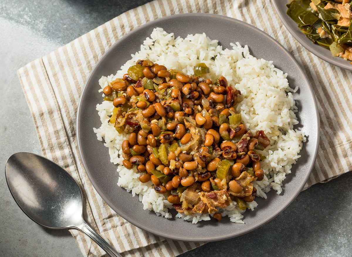 Hoppin’ John is a simple but tasty and savory blend of black-eyed peas, rice, and pork (like bacon or ham hock) that’s served on New Year’s Day for good luck and prosperity. The dish’s roots come from Africa and is a classic meal you’ll find in the South.